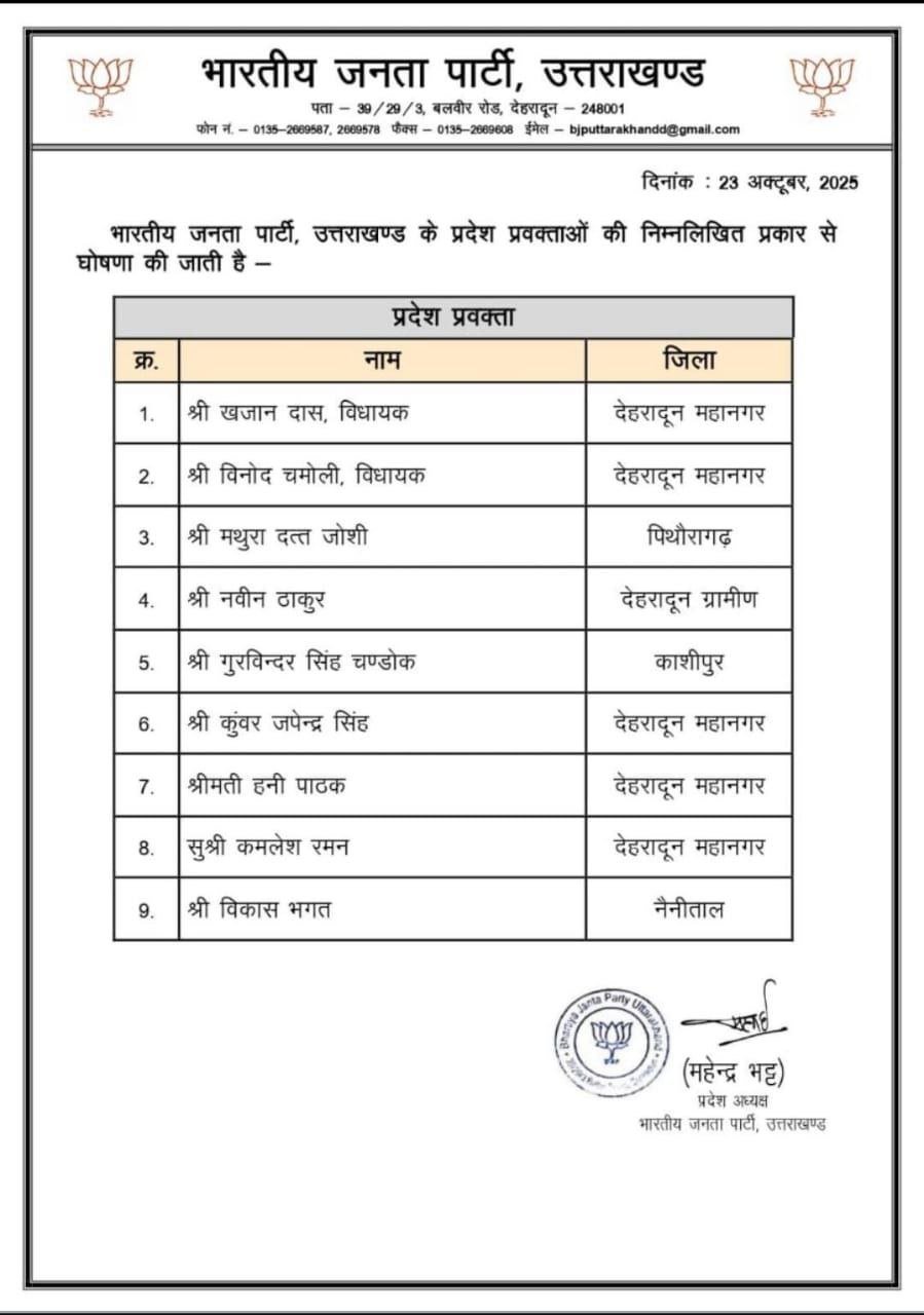 इसके अलावा, पिथौरागढ़ जिले से मथुरादत्त जोशी, काशीपुर से गुरविंदर सिंह चंडोक और नैनीताल जिले से विकास भगत को प्रवक्ता की जिम्मेदारी दी गई है।